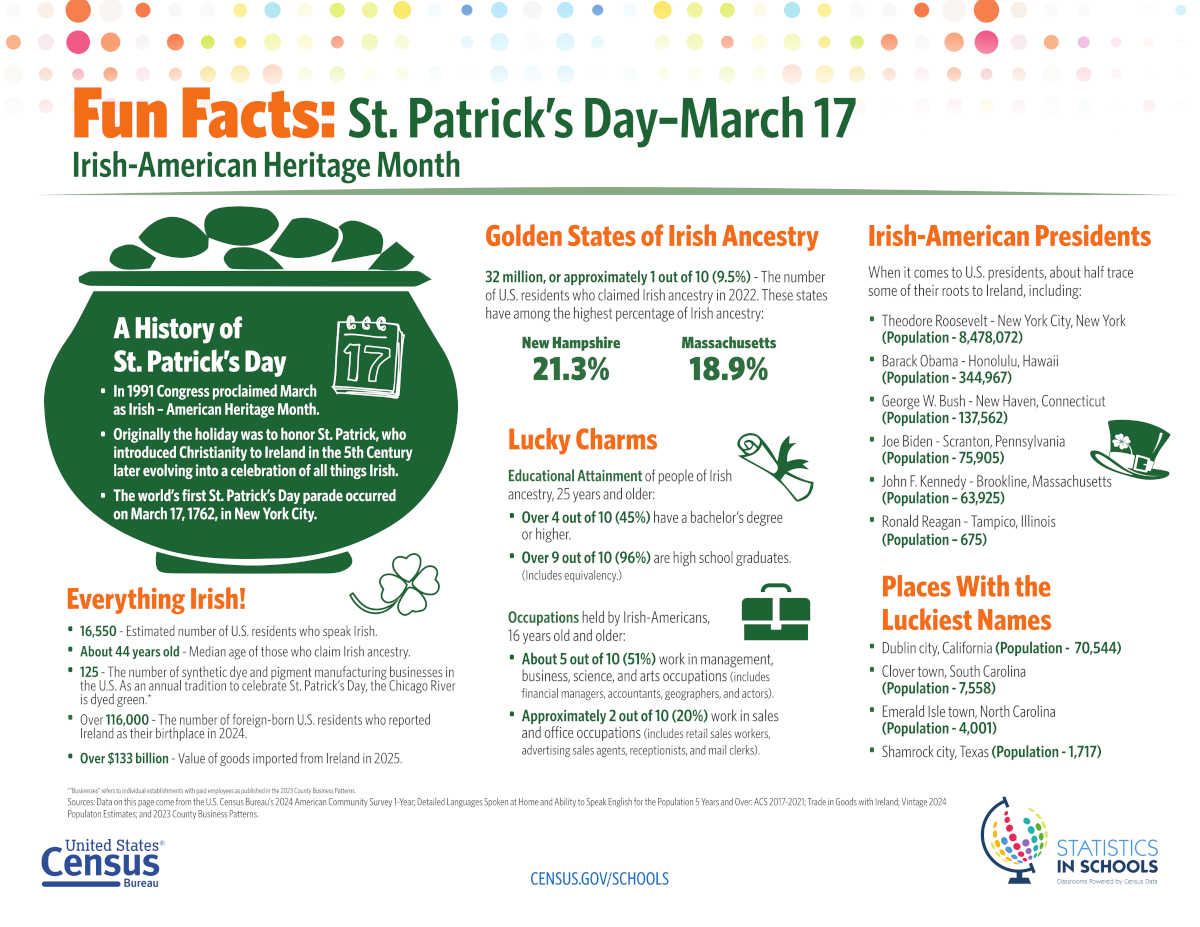 The U.S. Census Bureau is offering historical and current facts as part of its annual celebration of St. Patrick’s Day and March as Irish-American Heritage Month.