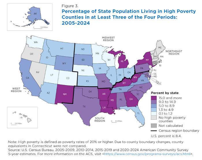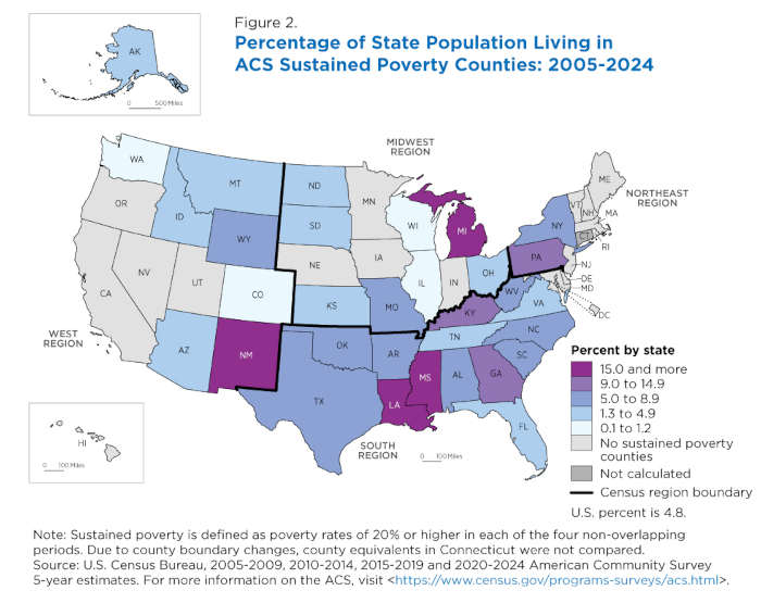 There was less of a southern concentration when measured by the share of people in the 2020-2024 poverty universe living in sustained poverty counties: 7.3% of the population in the South; 5.6% in the Northeast; 3.8% in the Midwest; and 1.0% in the West.