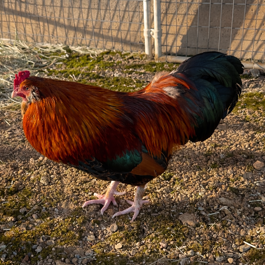 The rooster is reported to be three years old, with colorful red and dark-colored feathers.