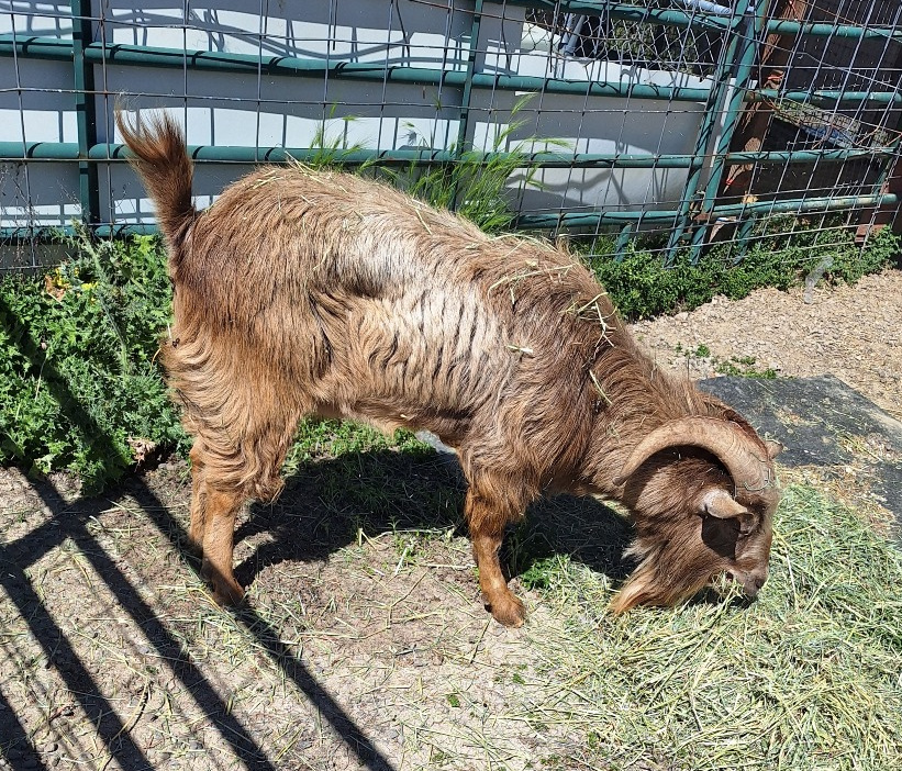 “Stewart” is a 2-year-old male goat with a long, reddish brown coat.