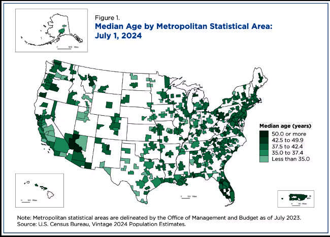 Median ages in metro areas in 2024 ranged between 26.4 and 68.1, with 192 metro areas having a median age higher than the nation’s.