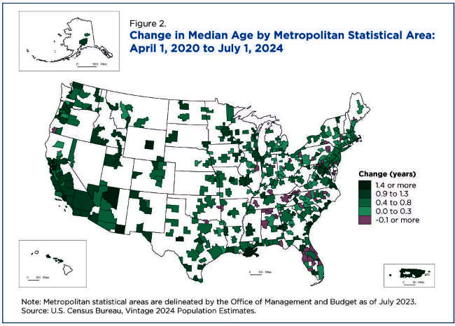 The median age increase in many metro areas aligned with the national aging trend: 61.2 million people aged 65 and over lived in the United States in 2024, up 13% from 54.2 million in 2020, in contrast to a decline in the number of children (ages 0 to 17).
