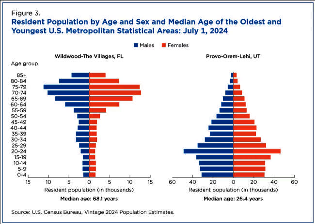 The result was two vastly different age structures in the nation’s oldest and youngest metro areas in 2024: Older adults dominated the population in Wildwood-The Villages, while there was a higher share of children and young adults in Provo-Orem-Lehi (Figure 3).