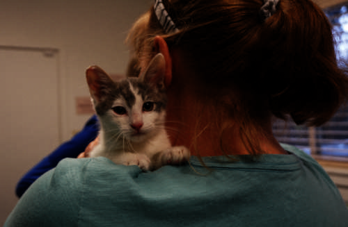 One friendly male kitten was happy to get out of his cage and be cuddled by Williams. And then it was back in the cage for rest and a snack.
