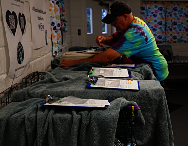 From there, the cats wait to be taken in for surgery and prep, with volunteers and vet techs getting them ready to hand them off to vet staff.