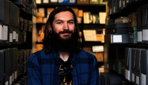 Zachary O’Hagan manages the California Language Archive. His job includes facilitating visits from the public and seeking materials that might be important additions to the collection. Photo by Brittany Hosea-Small/UC Berkeley.