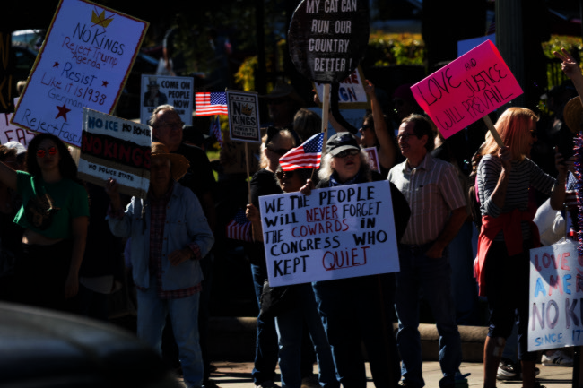 • Eat the rich, feed the poor. • A republic, if you can keep it. • Morons are governing America. • Freedom not Fuhrer. • Yes on Prop. 50. • Democracy can’t be Trumped. • Crazy cat ladies don’t like autocracies or bullies. • Make America kind again. • Your vote is your voice. • Democracy not autocracy. • America rejects kings. Get out! • No troops in American streets. No faux king way! • Trash Trump’s tariff taxes. • Dude, where’s my due process? • Hands off! Imagine hating immigrants more than pedophiles. • We the people deserve better. • Where is our Congress? • Release the Epstein files. • Too much wrong for one sign.