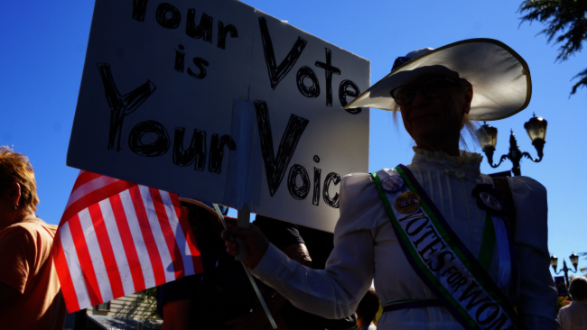 Among those in costume was Kate Schmidt-Hopper, dressed in a flowing white dress and large hat with a sign that said, “USA: Rejecting tyrants since 1776” on one side and “Your Vote is Your Voice” on the other.