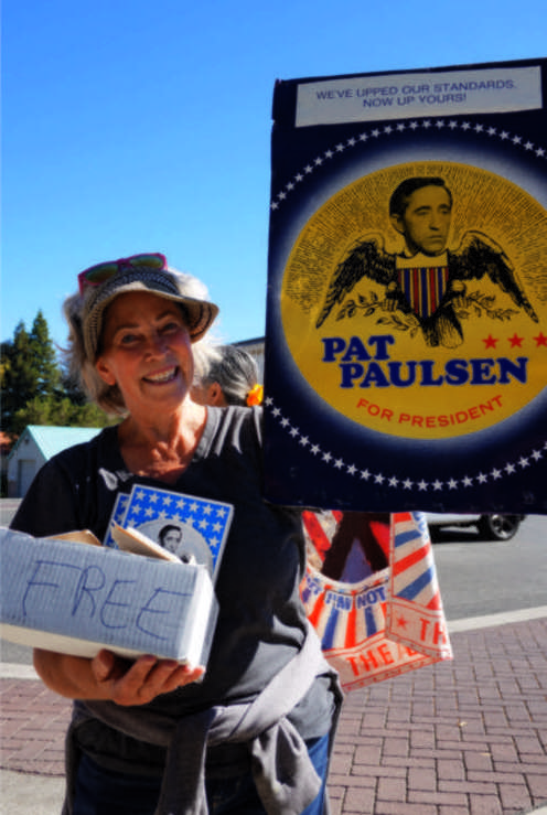 Down at the corner of Second and Main streets, Terri Paulsen of Lakeport carried a sign that said “Pat Paulsen for President.”