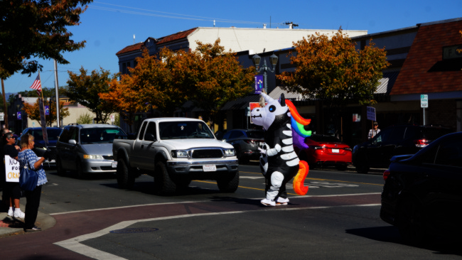 The mood in Lakeport was upbeat. In addition to a few thousand people, many accompanied by their pet dogs, there were a number of people in colorful inflatable costumes — including a few frogs in a homage to the Portland Frog, two unicorns and a squirrel.