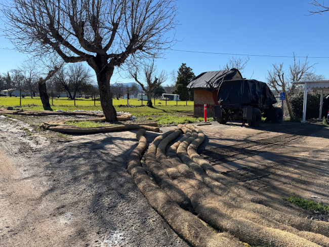 Straw wattles were placed in the spill area in an effort to keep the wastewater from residences. Photo by Lingzi Chen/Lake County News.